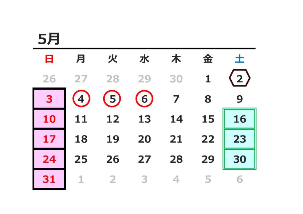 2026年5月の休業日は、2日(土)~6日(水)、16日(土)、23日(土)、30日(土)、各日曜日、となっております。